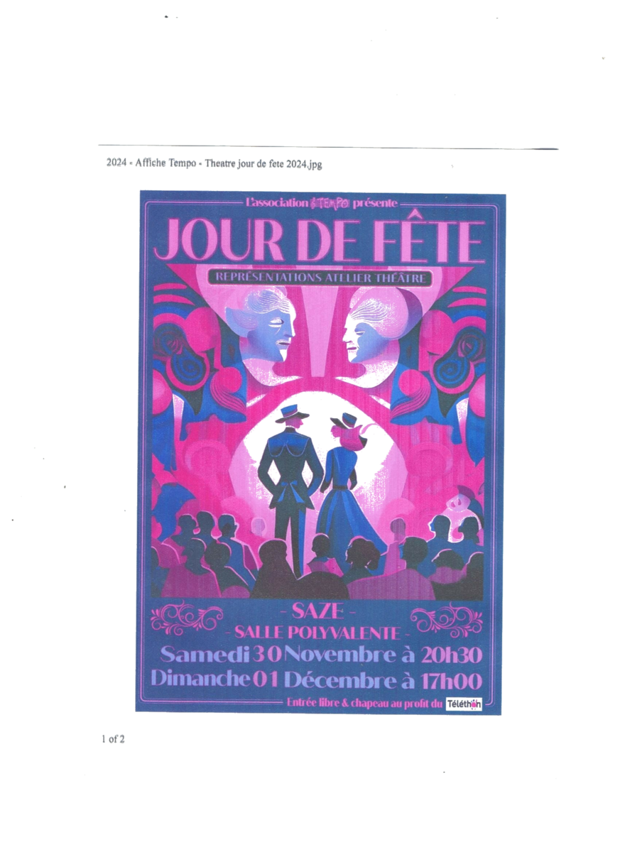 Le dimanche 01 déc. 2024 à 17h Lieu : Salle polyvalente 30 SAZE